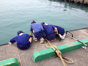 最後に糸の結び方。いきなり細い釣り糸では難しいので、ロープを使って擬似的に結んでみます。今回覚えたのは、クリンチノットと呼ばれる釣り人の間では比較的ポピュラー且つ使う場面の多い結び方です。最初にロープで練習したのが奏功したのか、実際に釣り糸とサルカン(よりもどしとも言う)を結ぶ際には、ものすごい集中力で全員が取り組みました。さすがに2年生のうさぎのスカウト達には難易度が高かったのですが、最後まであきらめずに取り組む姿勢に、大きな将来性を感じました。