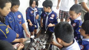 BBQの準備をしている間に、スカウトたちは鋸を使う練習をしたり、ロープワークを練習したり。細い竹を切って、サンドペーパーを当てて、チーフリングを造りましたよ。