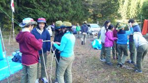 2日目はスキルの確認をしながら、ゲーム対抗戦で、縄結びリレー、班旗立てゲーム、手旗信号リレーを行ないました。班対抗は班対抗でも、団対抗でもあり、いざ勝負となると、お互いにちょっと真剣になってきます。